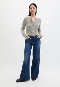 Femme aux cheveux noirs lisses portant un cardigan en maille texturée gris clair avec des boutons noirs et un jean en denim bleu, les mains dans les poches.