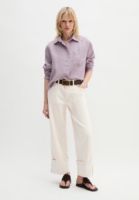Femme aux cheveux blonds portant une chemise lavender ample à boutons rentrée dans un pantalon blanc taille haute avec une ceinture noire.