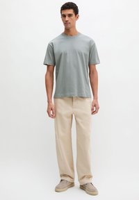 Jeune homme portant un t-shirt à manches courtes gris clair et un pantalon beige, debout devant un fond blanc uni.