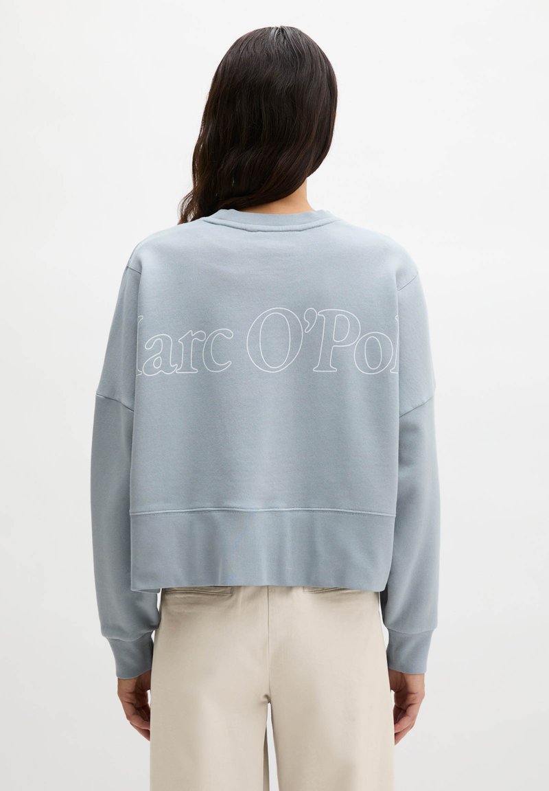 Femme aux cheveux longs et foncés portant un sweat-shirt bleu clair avec le texte "Marc O'Polo" dans le dos et un pantalon beige, debout devant un fond uni.
