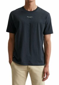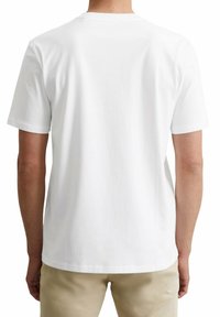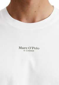 Homme portant un t-shirt blanc uni à manches courtes avec un petit logo « Marc O'Polo » sur la poitrine, accompagné d’un pantalon beige, mains détendues le long du corps.