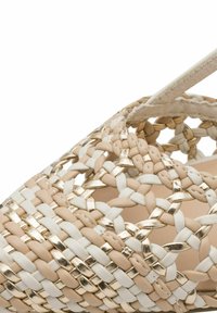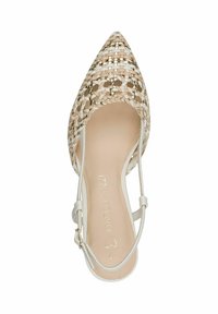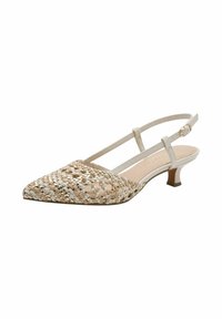 Chaussure beige tissée à bride arrière avec bout pointu, dotée d'une tige texturée, d'un petit talon bas et d'une bride ajustable.