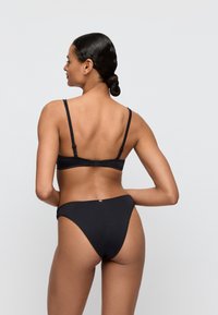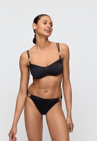 Femme portant un bas de bikini noir avec des détails en anneau doré sur les hanches, montrant un gros plan du bas du torse et du haut des cuisses.