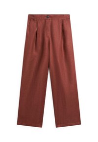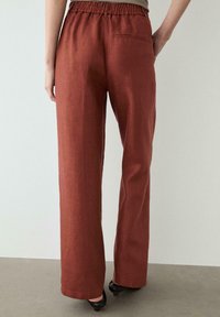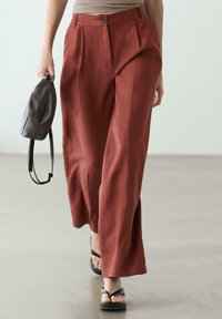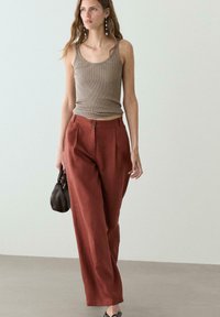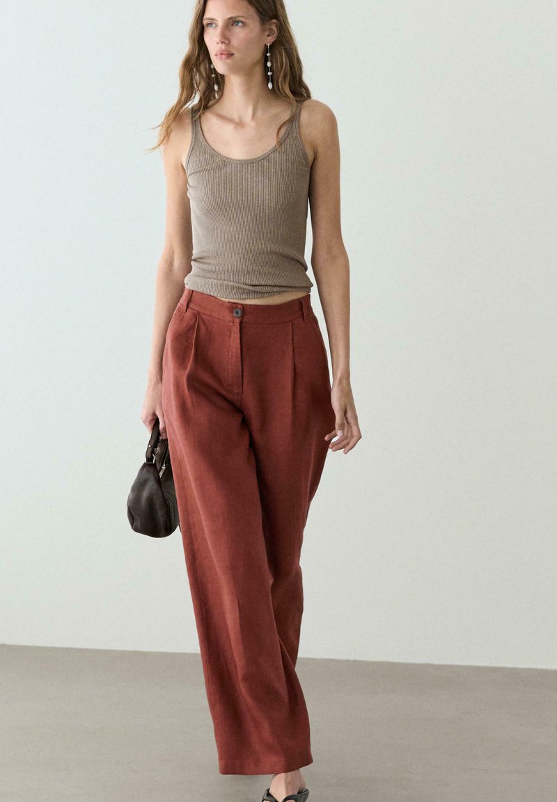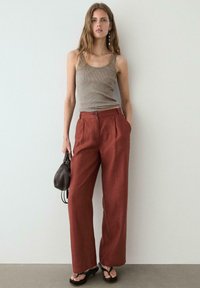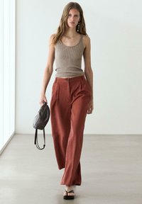 Femme marchant portant un haut sans manches beige côtelé, un pantalon large taille haute couleur rouille, portant un petit sac à main brun foncé.