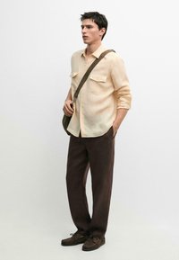 Homme portant un pantalon à cordon de serrage marron foncé, une chemise beige à manches longues avec les manches retroussées, et des chaussures décontractées marron foncé.
