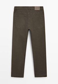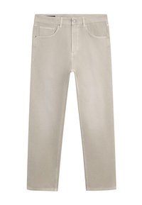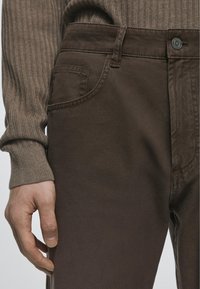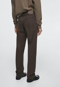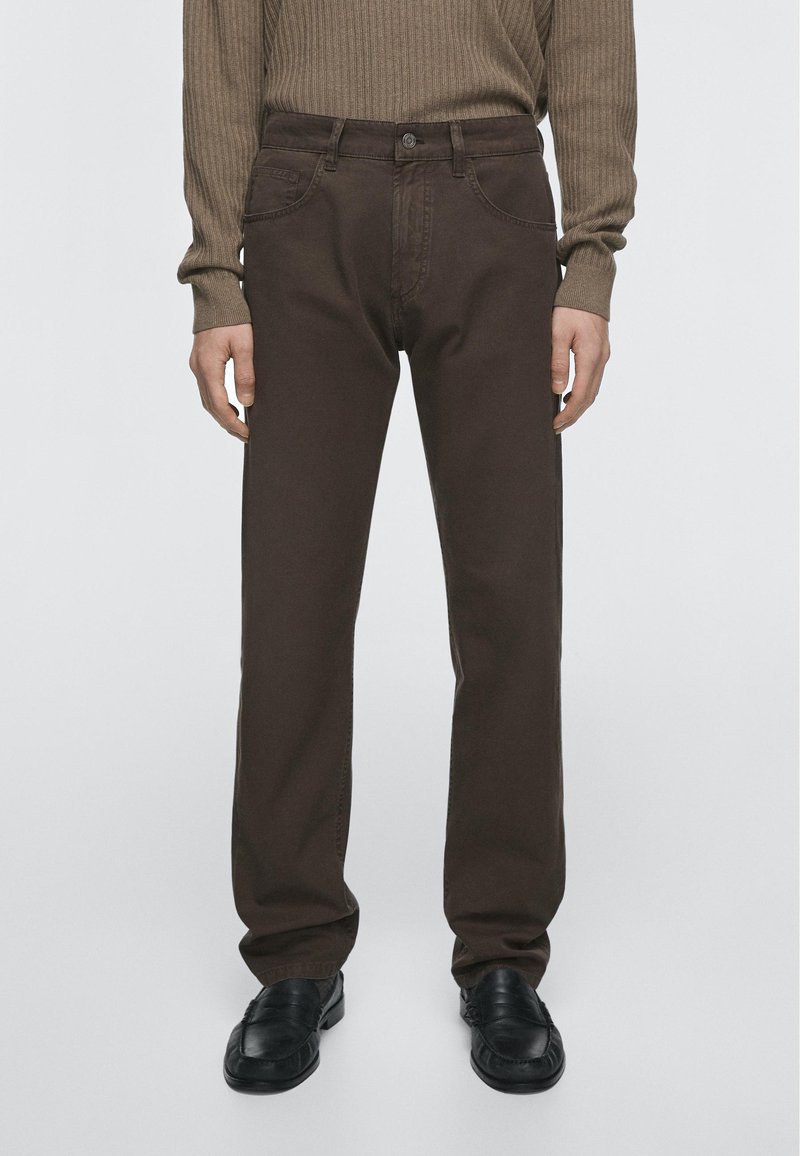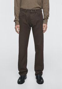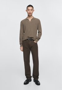 Homme portant un pantalon droit marron, une chemise beige à manches longues côtelées et des mocassins en cuir noir, debout sur un fond clair uni.