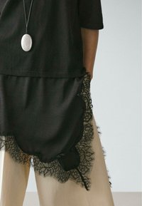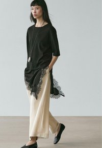 Femme aux cheveux longs et foncés portant un haut noir avec des détails en dentelle, un pantalon large beige, des chaussures noires et un long collier pendentif, marchant vers l'avant.