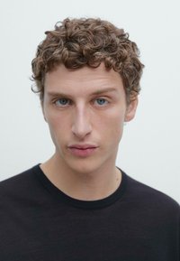 Jeune homme aux cheveux bouclés portant une chemise noire à manches courtes et un pantalon beige clair, debout devant un fond clair uni.