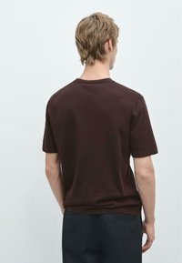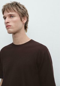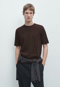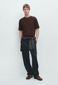 Jeune homme aux cheveux courts portant un t-shirt marron foncé et un pantalon noir, avec un pull rayé noué autour de la taille, debout contre un mur clair.