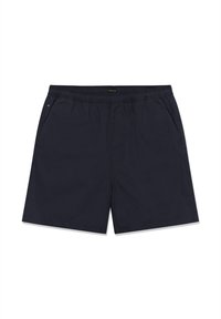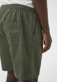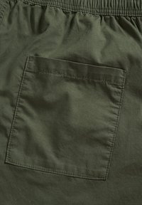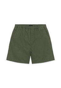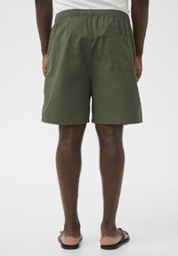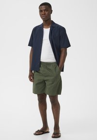 Homme portant un short vert olive, une chemise bleu marine et des tongs noires, se tenant devant un fond clair uni.