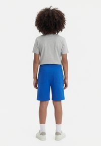 Enfant aux cheveux bouclés portant un t-shirt gris, un short bleu avec un logo blanc, des chaussettes blanches et des baskets blanches, debout avec une main dans la poche.