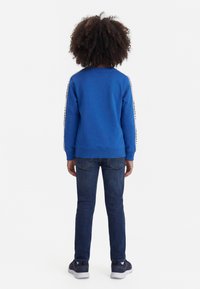 Enfant aux cheveux bouclés portant un t-shirt à manches longues bleu, un jean foncé et des baskets foncées, debout avec une expression neutre sur un fond blanc.
