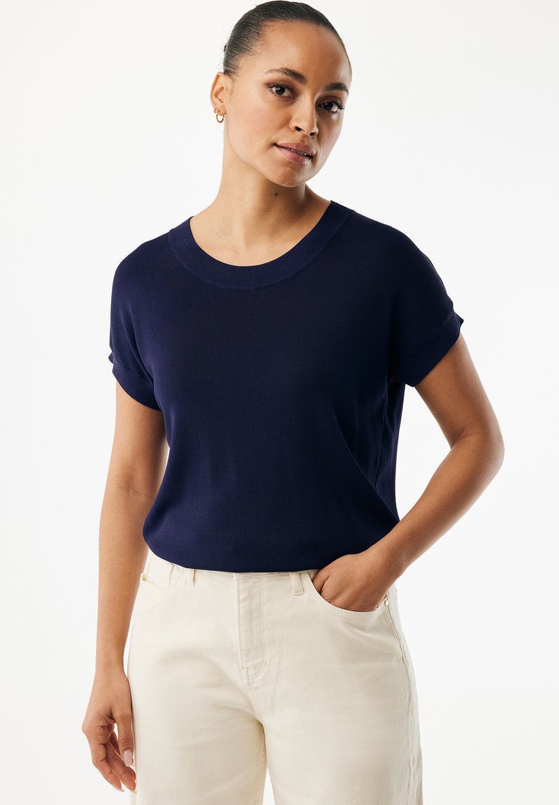 T-shirt bleu marine à manches courtes avec une texture côtelée, présentant un col rond et une coupe décontractée, associé à un pantalon de couleur claire.
