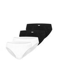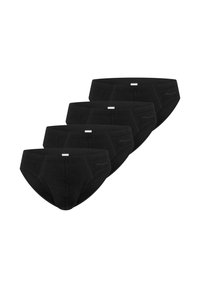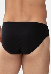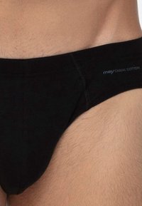 Buste masculin portant un slip en coton noir avec l’étiquette « mey casual cotton », mains croisées à la taille, fond neutre.