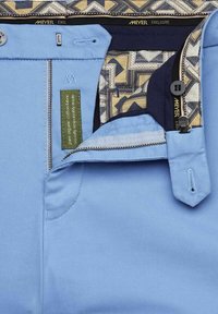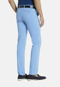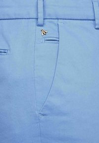 Homme portant un pantalon bleu clair à coupe droite, ceinture noire, mocassins bleu marine, et une chemise bleue rentrée, debout devant un fond blanc.
