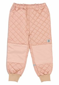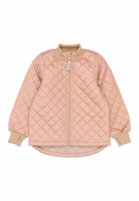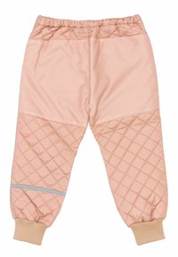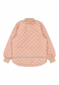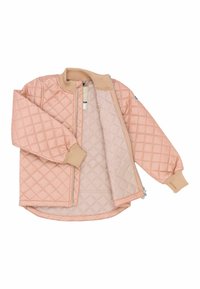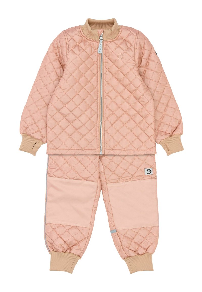 Ensemble deux pièces matelassé en rose doux. Comprend une veste zippée avec col et poignets côtelés, associée à un pantalon assorti avec poignets.