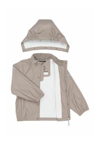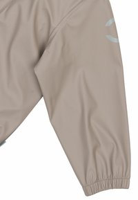 Veste imperméable beige avec capuche et poignets élastiques, associée à un pantalon assorti doté d'une bande réfléchissante et de bretelles ajustables.