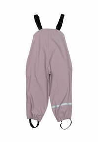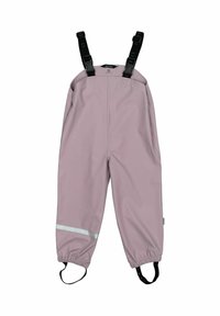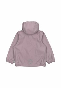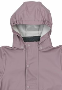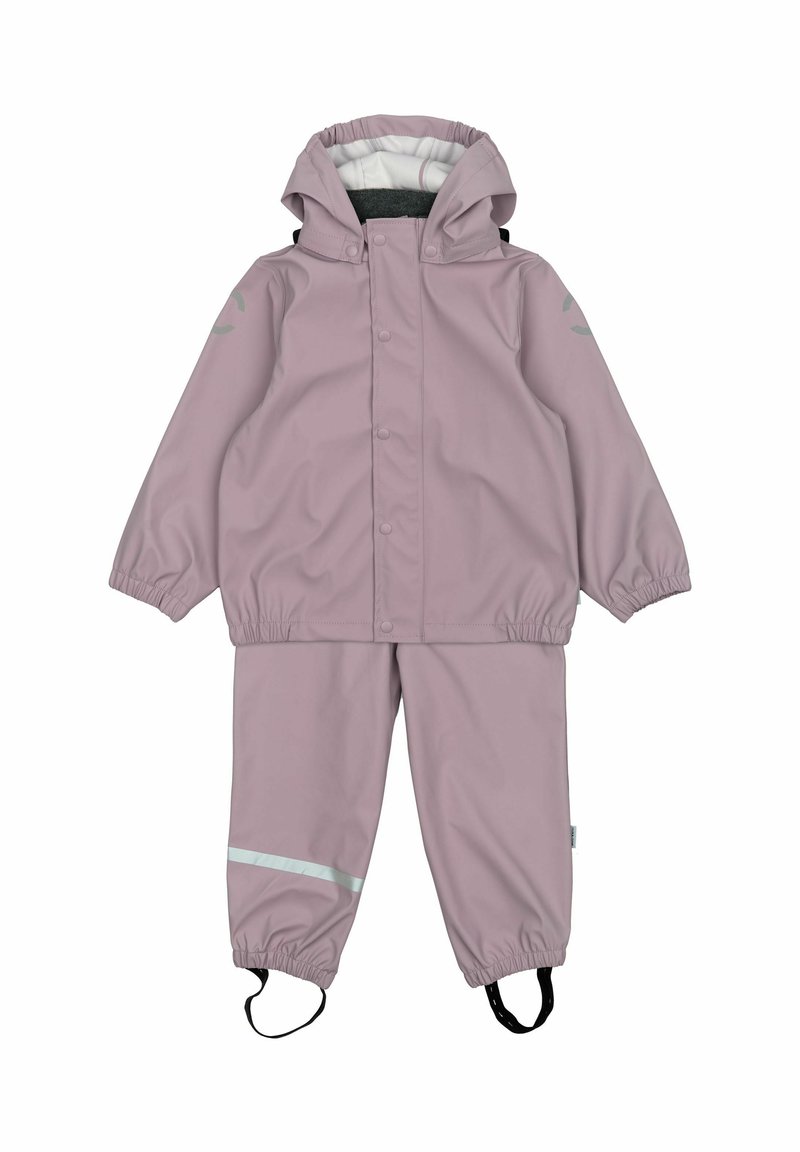 Combinaison de pluie imperméable pour enfants en rose clair, avec capuche, poignets élastiques, fermeture à pression et accents réfléchissants gris sur les manches et le pantalon.