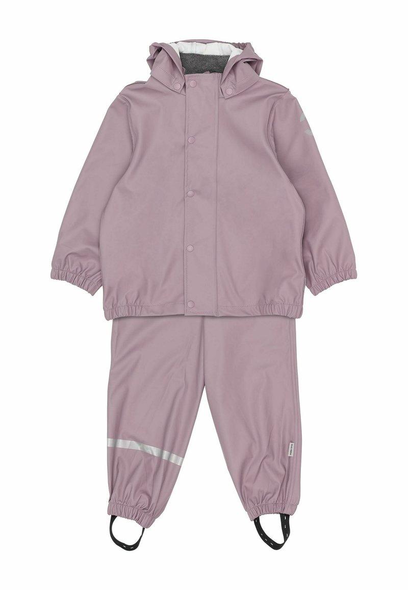 Ensemble veste et pantalon de pluie imperméables pour enfants en violet clair, avec poignets élastiques, capuche et bande réfléchissante sur la jambe du pantalon pour la sécurité.