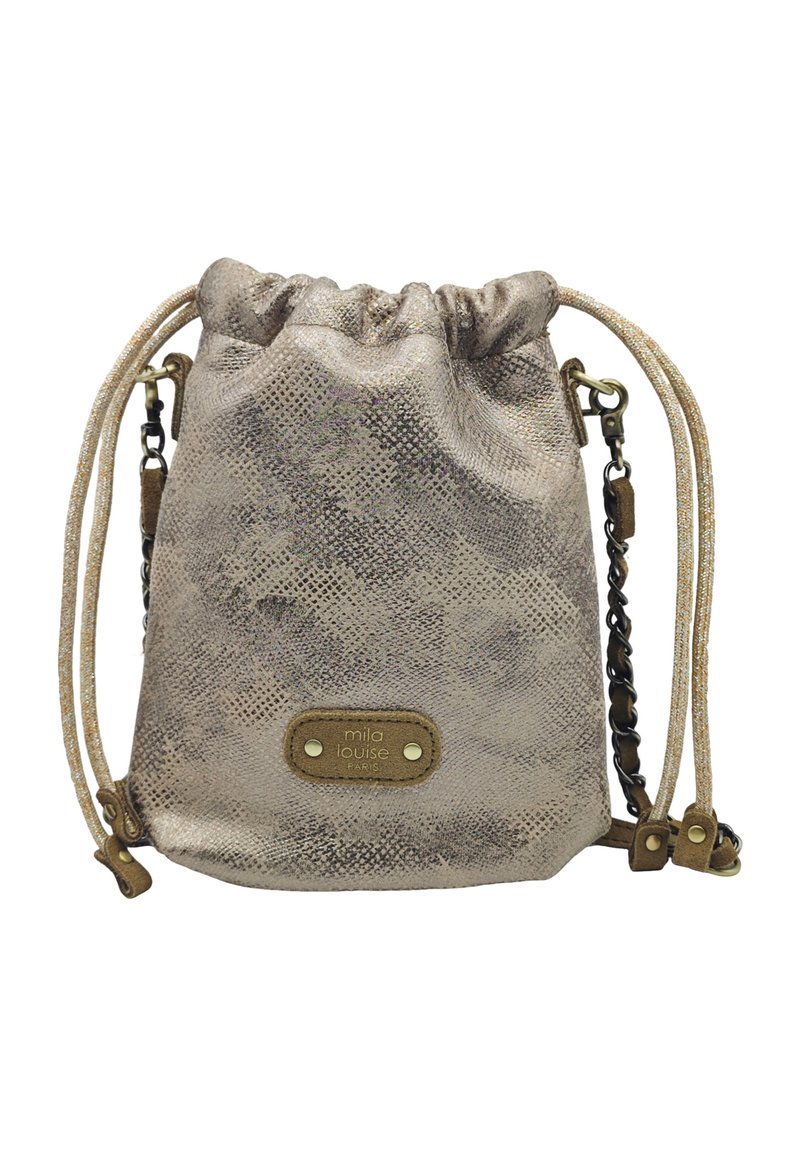 Petit sac bourse métallique à imprimé serpent avec fine bretelles et une étiquette en cuir indiquant « mila louise Paris » à l'avant.
