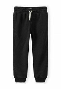 Trois pantalons de jogging pour enfants en gris clair, noir et rose pâle, chacun avec une ceinture élastique et un cordon de serrage.