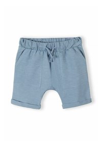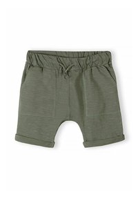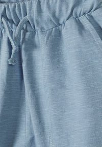 Trois paires de shorts à taille élastique avec cordons de serrage en marine, vert olive et bleu clair, disposées verticalement sur un fond blanc.