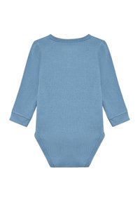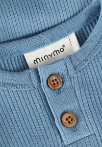 Body bleu clair côtelé à manches longues, encolure ronde, deux boutons en bois au col, et fermetures à pression au bas.