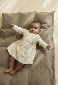 Robe fleurie de couleur claire avec bordure en dentelle, superposée sur une chemise blanche à manches longues. Le bébé est couché sur une couverture beige texturée.