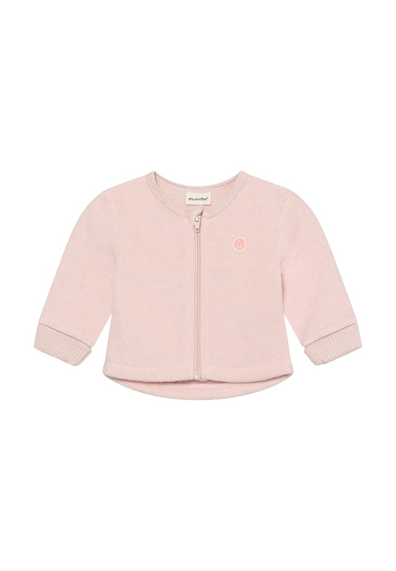 Veste zippée rose clair en tissu doux. Comprend des manches longues, des poignets côtelés et un petit détail de logo à l'avant. Texture lisse.