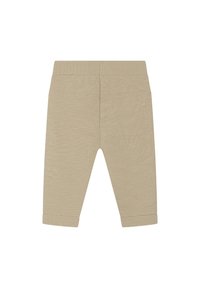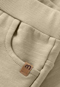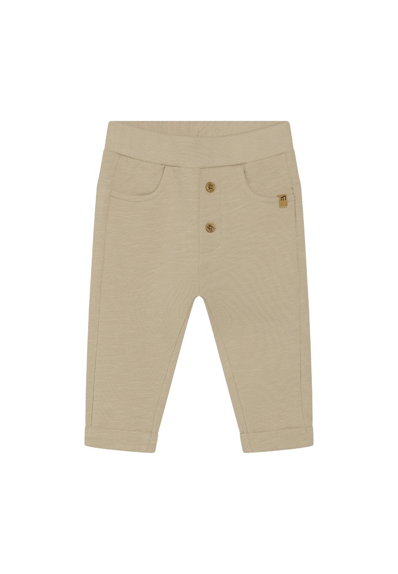 Pantalon beige en coton pour tout-petit avec une ceinture côtelée, deux poches avant et deux boutons décoratifs à l'avant. Revers roulés en bas.