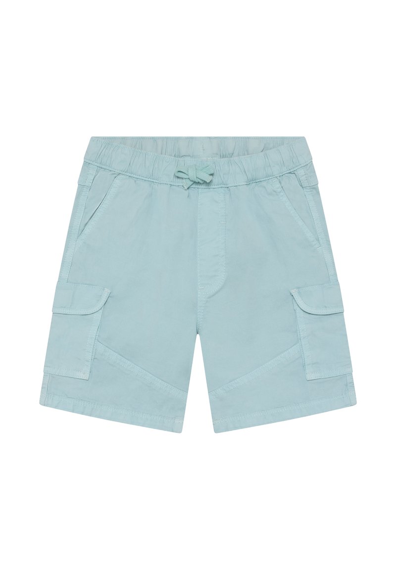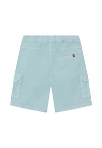 Shorts bleu clair en coton, dotés d'une taille élastique avec cordon de serrage, poches latérales et deux poches cargo.