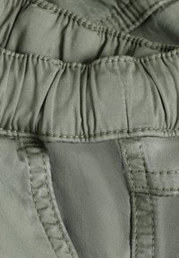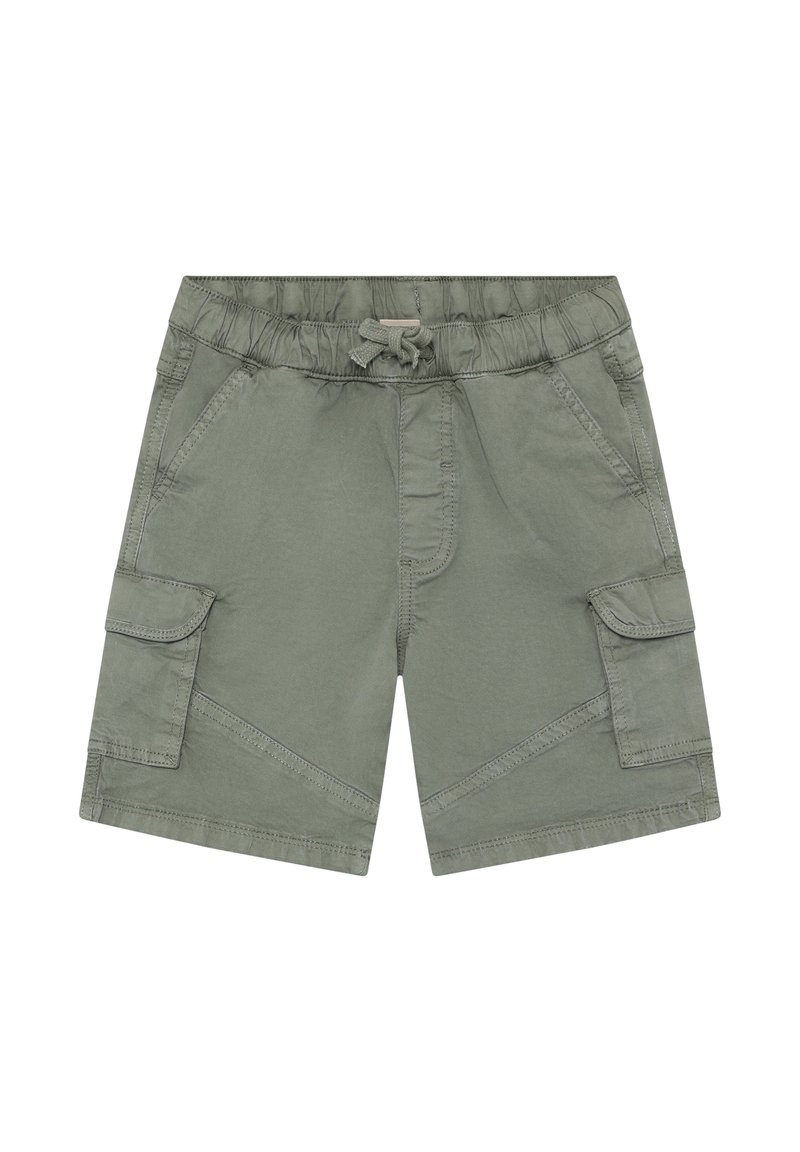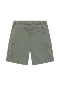 Shorts cargo verts avec une taille élastique et un cordon de serrage. Ils disposent de deux poches latérales et de deux poches cargo avec rabats.