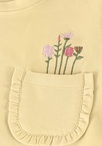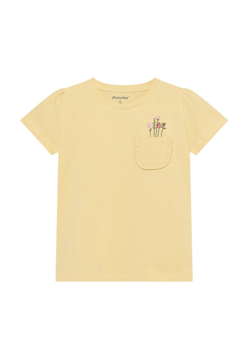 T-shirt en coton jaune à manches courtes, avec une poche à volants et une broderie florale rose et verte sur la poitrine.