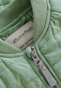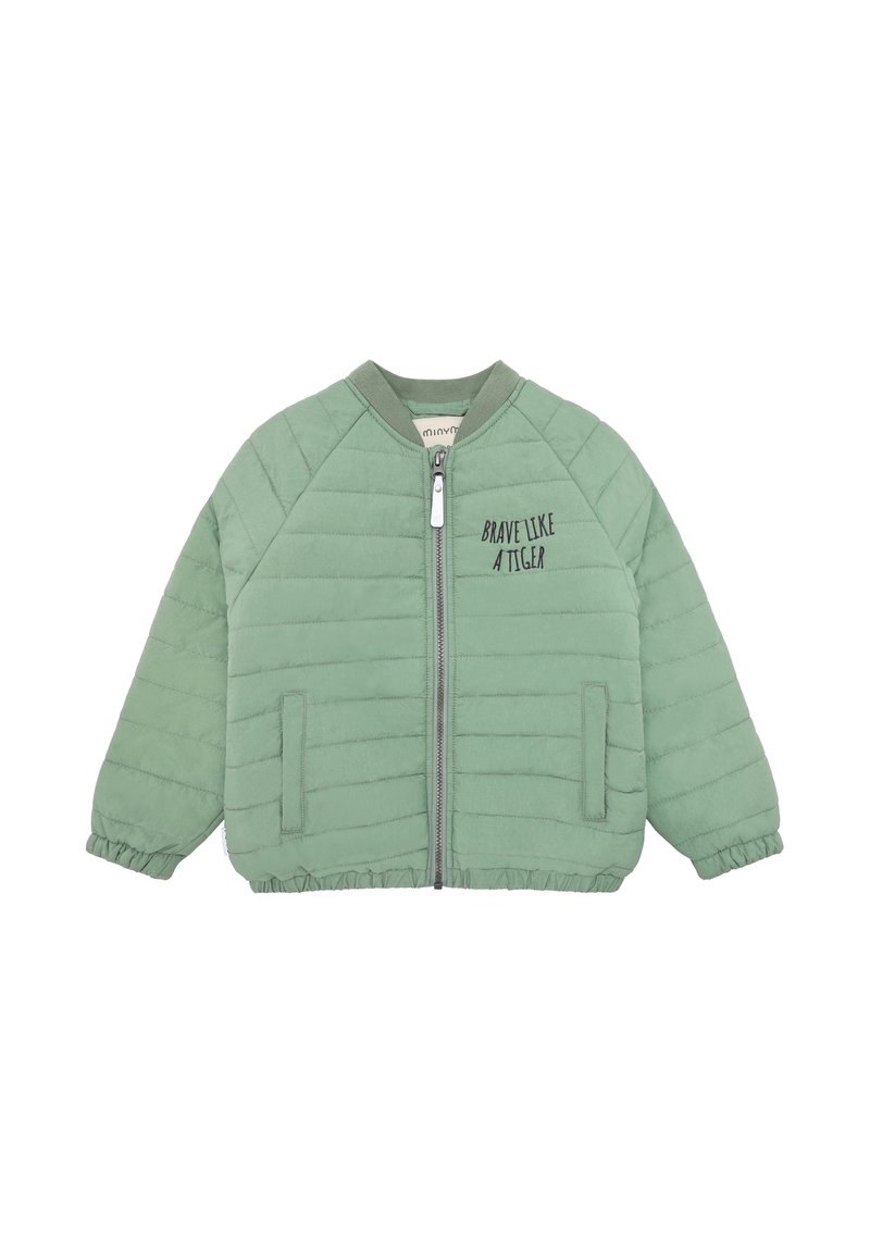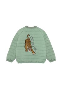 Veste matelassée pour enfants de couleur vert clair avec fermeture éclair frontale, poignets élastiques et texte "BRAVE LIKE A TIGER" sur la poitrine.