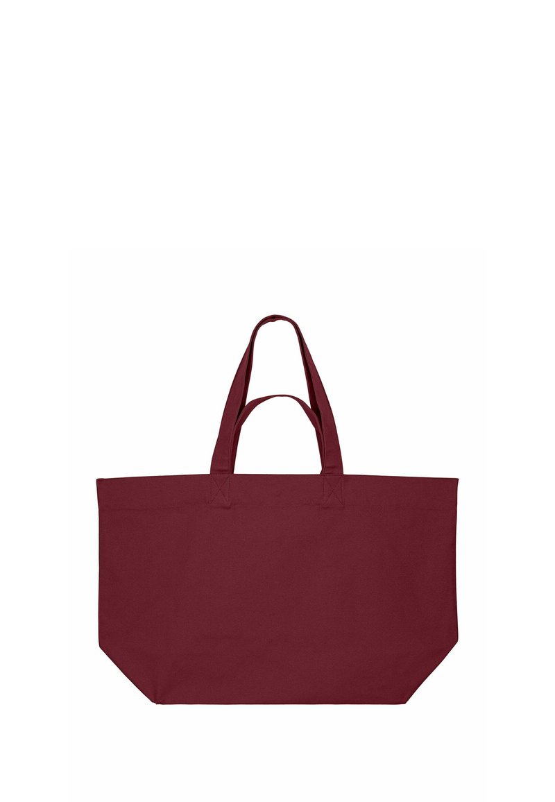 Grand sac cabas bordeaux avec deux poignées courtes et deux longues, base rectangulaire, et design simple sans logos ni motifs visibles.