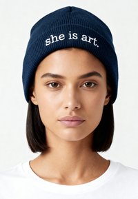 Bonnet en tricot bleu marine avec une texture côtelée, arborant le texte « she is art. » brodé en blanc sur le devant. Porté avec un T-shirt blanc.