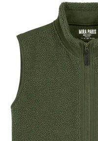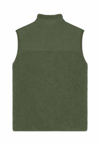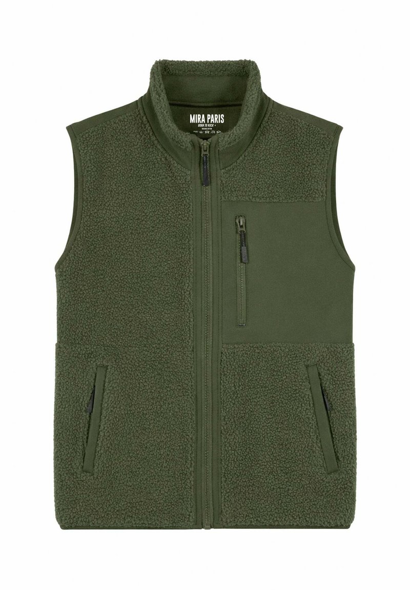 Veste sans manches en polaire vert olive avec fermeture éclair frontale, deux poches zippées basses, une poche poitrine zippée et col montant.