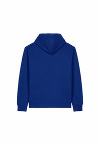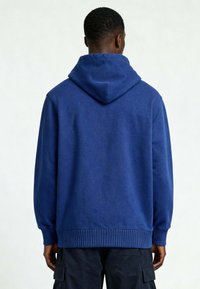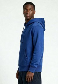 Jeune homme debout, droit, portant un sweat à capuche bleu avec poche avant et cordons, associé à un pantalon noir, sur un fond uni.