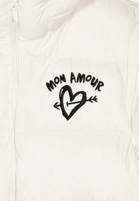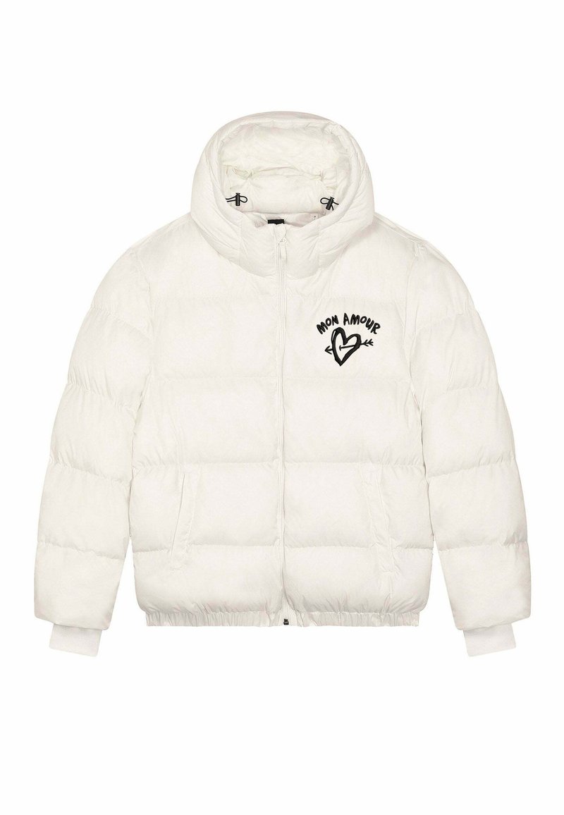Doudoune blanche avec col montant, dotée d'une fermeture éclair devant, de deux poches latérales et d'un graphisme noir "MON AMOUR" sur la poitrine.