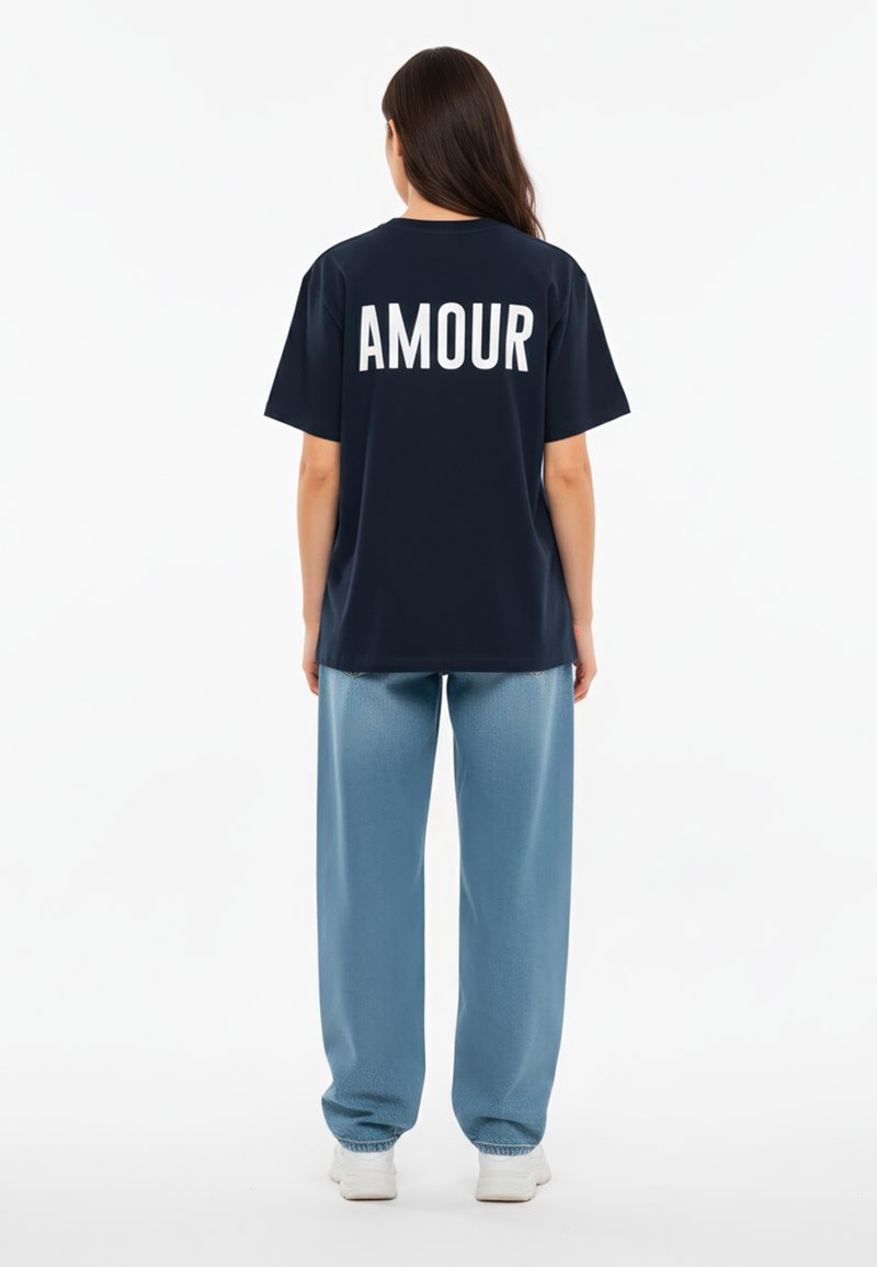 T-shirt bleu marine avec "AMOUR" imprimé en grandes lettres blanches au dos, associé à un jean ample bleu clair et des baskets blanches.