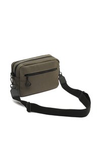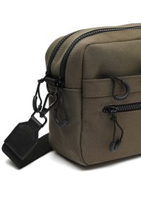 Sac bandoulière compact vert olive avec sangle noire réglable, poche zippée à l'avant et petit détail logo dans le coin inférieur droit.