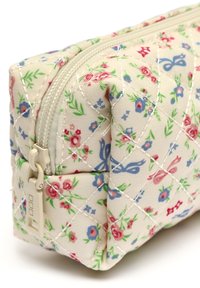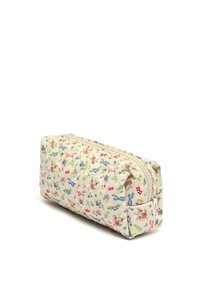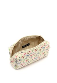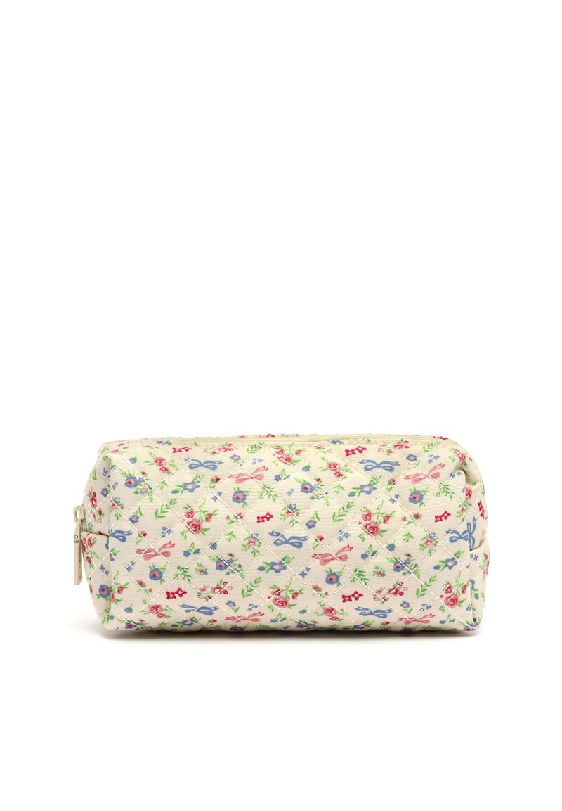 Pochette rectangulaire matelassée avec fermeture éclair, fond crème, décorée de petites fleurs roses, rouges, bleues et de feuilles vertes en motif losange.