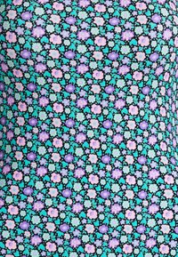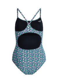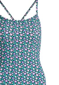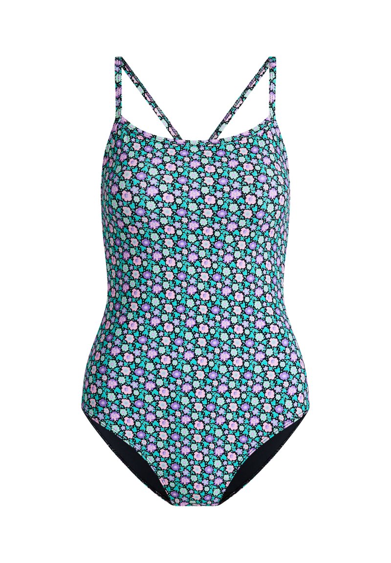 Maillot de bain une pièce avec fines bretelles et un motif floral multicolore en turquoise, violet et rose clair sur fond noir.