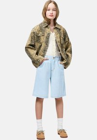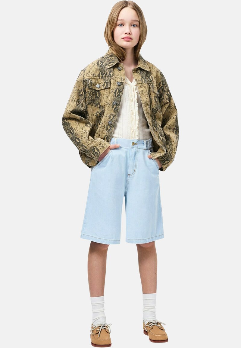 Veste oversize imprimé serpent marron, blouse crème, short en jean bleu clair, chaussettes blanches à la cheville et chaussures à lacets couleur tabac avec une surface texturée.