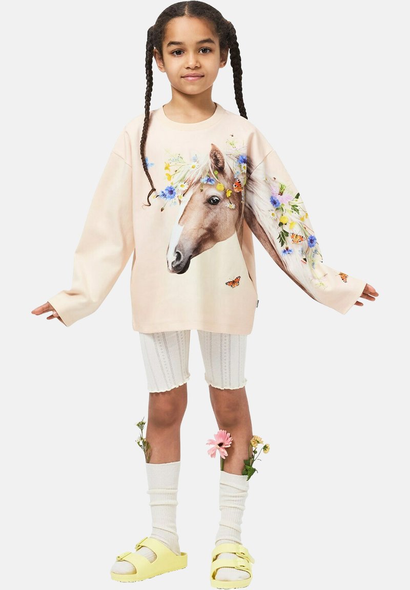 Sweat-shirt rose clair avec un motif de cheval et des accents floraux. Porté avec un short blanc côtelé et des sandales jaunes avec des nœuds.