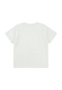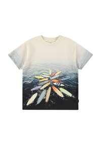 T-shirt blanc à manches courtes avec imprimés colorés de planches de surf, associé à un short en jean bleu clair et des chaussettes bleues à motifs.