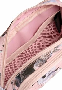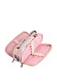 Trousse à crayons en tissu rose ornée de diverses illustrations de chevaux et de chevaux ailés ; fermeture double zip et accents en métal gris.