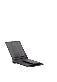 Portefeuille bipli en cuir noir avec logo embossé discret sur le devant, photographié sur un fond blanc uni.