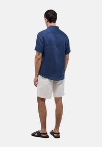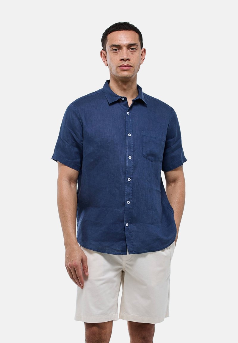Chemise en lin bleu marine à manches courtes, avec un col boutonné et une poche poitrine. Dotée de boutons blancs et d'un design décontracté.