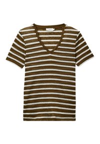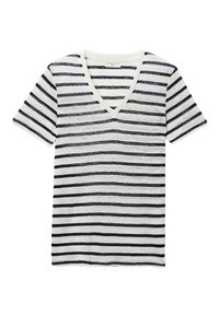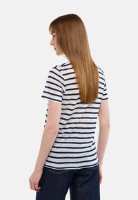 Jeune femme aux cheveux rouges lisses portant un t-shirt à col en V blanc rayé de bleu marine et un jean bleu foncé, debout les mains sur les hanches.